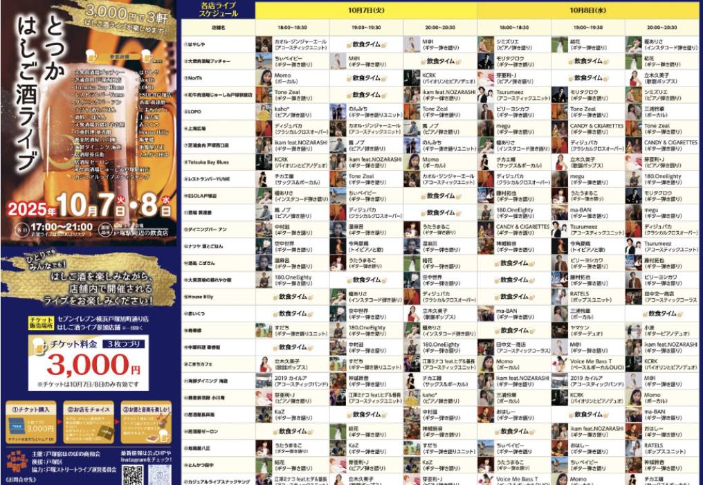 チケット3枚つづり3000円で販売、ハシゴ酒イベントは近隣の登録店18店舗での使用が可能です。各店舗チケット1枚でワンドリンク+おつまみ付で派遣されたアーティストの音楽が楽しめます。登録店や出演アーティスト、そしてドリンク&おつまみ等の内容は『とつかハシゴ酒』で検索して御確認下さい。